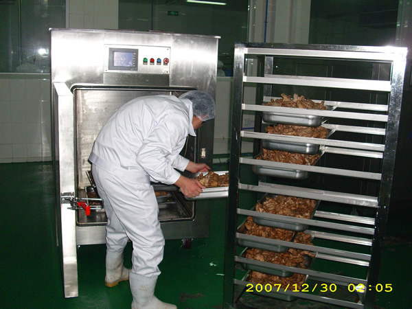 2、用強冷風冷卻(冷卻隧道),時間可縮短,但中心溫度仍下降緩慢,自然冷卻的缺陷仍然存在,冷卻不均勻導致食品外冷內熱,大大降低了食品的風味。使用強冷風冷卻的另一個很大缺陷就是能源消耗很大。真空冷卻的迅速降溫,阻止了食品因本身加工完畢后自身余熱的作用造成的過度熟化,過度熟化會讓食品失去本身的特殊香味。(例如,炒制的綠葉菜,如不經過20分鐘內迅速的降溫,那么它將會褐變,顏色不再鮮艷)